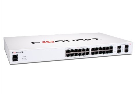 Fortinet-FS-124F-POE-FortiSwitch-124F-POE Layer 2 FortiGate switch controller compatible PoE+ switch with 24x 1G RJ45 and 4x 10G/1G SFP+/SFP ports and 1x RJ45 console port. Ports 1 to 12 support PoE+ with maximum 185W PoE output limit with smart fan/temperature control.