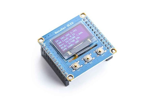 Il modulo OLED NanoHat ha lo stesso fattore di forma di NanoPi NEO di FriendlyElec. Può essere impilato su un NanoPi NEO.