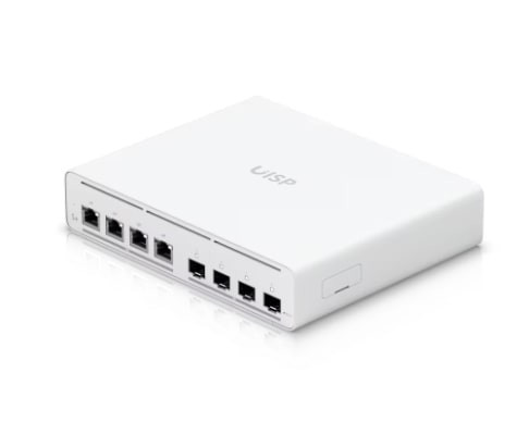 Ubiquiti - UISP-S-Plus-EU - Switch for ISP application with (4) 2.5 GbE RJ45 ports with 27V passive PoE output, (4) 10G SFP+ ports, 60W (27V) total PoE availability*, 20W/port (2-pair) / 40W/port (4-pair), Port isolation, speed limiting, and DHCP snooping functionality