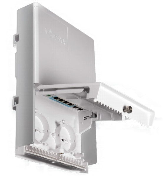 MikroTik outdoor reverse PoE switch with Gigabit Ethernet and 10G SFP+ ports