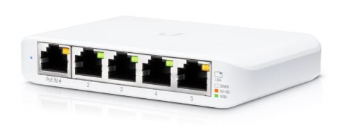 Lo switch UniFi, modello USW-Flex-Mini, è uno switch Gigabit gestito in modo intelligente. Offre 5 porte Ethernet RJ45, che forniscono collegamenti 1 Gigabit ai dispositivi.