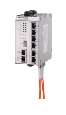 Microsens-MS650929PM-Industrial Gigabit Ethernet Switch, 4x 10/100/1000T, 2x High Power 60W PoE+ (PSE), 1x 10/100/1000T PoE+ (PD), 2x Dual Media Ports: 100/1000X SFP-Slot or 10/100/1000T, integrated CPU, Serial Port, USB Port, SD Memory Card Slot, I/O: 2x in, 2x out, 2x power input 24..57 VDC