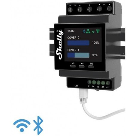 Quadruplo smart relè con misurazione consumi, schermo LCD e pulsanti di controllo fisici, 4 relè da 16A (40A totali), formato barra DIN, include tutte le funzionalità del chip Shelly Pro.