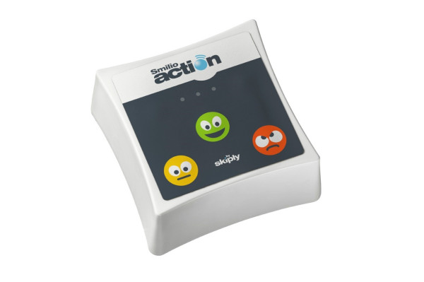 Smilio Action / 3 Smileys è un dispositivo composto da 3 pulsanti collegati che consentono di interagire in tempo reale con i clienti per conoscerne il livello di soddisfazione. In caso di insoddisfazione o malfunzionamento, un avviso può essere inviato via SMS al fine di innescare, ad esempio, l'intervento di un tecnico. Grazie a un sistema di badging integrato, Smilio Action è in grado di intervenire tempestivamente sullo staff (Proof of Presence).