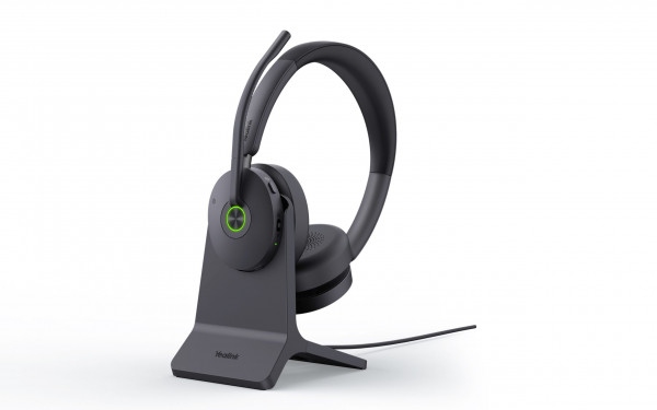 Yealink BH74 Wireless ANC Bluetooth Headset with charging stand.